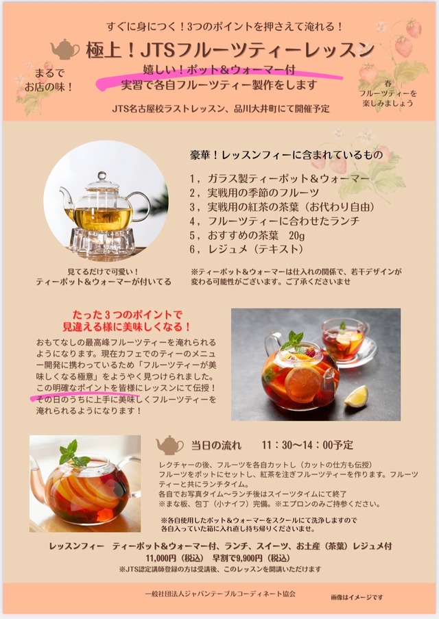 【まるでお店の味✨すぐに身につく!3つのポイントを押さえて淹れる 極上!JTSフルーツティーレッスン✨開催します】※画像はイメージです 名古屋開講 ※嬉しい!ポット&ウォーマー付実習で各自フルーツティー製作をします ※JTS名古屋校開催 (ラストレッスン) ※品川大井町にて開催予定 ☘️豪華!レッスンフィーに含まれているもの 1, ガラス製ティーポット&ウォーマー 2,実践用の季節のフルーツ 3,実践用の紅茶の茶葉(お代わり自由) 4,フルーツティーに合わせたランチ 5,おすすめの茶葉 20g 6,レジュメ(テキスト) ※ティーポット&ウォーマーは仕入れの関係で、若干デザインが変わる可能性がございます。 ご了承くださいませ ◾️たった3つのポイントで見違える様に美味しくなる!おもてなしの最高峰フルーツティーを淹れられるようになります。 現在カフェでのティーのメニュ一開発に携わっているため「フルーツティーが美味しくなる極意」をようやく見つけられました。 この明確なポイントを皆様にレッスンにて伝授! その日のうちに上手に美味しくフルーツティーを淹れられるようになります! ◾️日程 ①4/8 水曜日 ②4/11 土曜日 ✖️満席です ③4/26 日曜日 ◾️当日の流れ 11:30~14:00予定 レクチャーの後、フルーツを各自カットし(カットの仕方も伝授) フルーツをポットにセットし、紅茶を注ぎフルーツティーを作ります。フルーツティーと共にランチタイム。 各自でお写真タイム~ランチ後はスイーツタイムにて終了 * まな板、包丁(小ナイフ)完備。※エプロンのみご持参ください。 * 各自使用したポット&ウォーマーをスクールにて洗浄しますので各自入っていた箱に入れ直し持ち帰りくださいませ。 ◾️会場 JTS名古屋スクール(四月末移転予定) 11:30〜14:00 ◾️名古屋市東区葵1丁目 地下鉄東山線新栄町駅徒歩1分 ◾️レッスンフィー ティーポット&ウォーマー付、ランチ、スイーツ、お土産(茶葉)レジュメ付 11,000円(税込) 早割で9,900円(税込) ※早割は予告なく終了します。 ※JTS認定講師登録の方は受講後、このレッスンを開講いただけます 一般社団法人ジャパンテーブルコーディネート協会